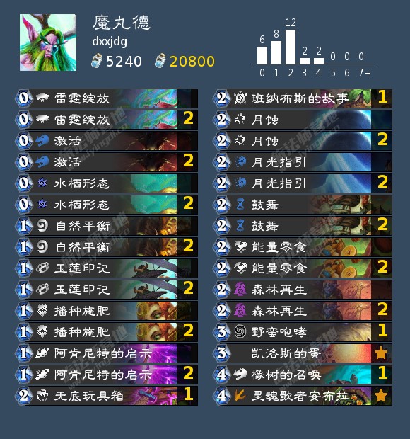 1号全程魔丸德10星上传,胜率85%左右,p1是上传排名,p2是又打了几把之后的最终排名,不算很高,主要是分享一下这套地沟油(应该算吧)自然平衡可以换成新卡生命循环,可以根据喜好增减跳费卡和检索卡的数量 首先是对战一些卡组的优劣开,主要是我打下来个人的感受,如果有不对的请谅解谢谢喵大优:弃牌术,猪猪术,任务术小优:海盗瞎,暗牧,圣契骑,大哥萨,奇迹贼小劣:任务瞎,各类宇宙大劣:所有法师,风歌德,元气骑 打法:卡组带了许多检索和跳费,我们要做的就是尽快凑齐组件,然后安布拉+魔丸启动即可。可以顺序启动4+3,也可以提前出蛋,下回合安布拉加任意破蛋启动,常用于后手打快攻,3费出蛋,4费硬币安布拉+1费破蛋(消灭或给蛋贴buff撞掉),可以直接劝退对手。技能的一点甲很重要,如果你已经准备启动或启动完成但血量不健康,多出来的费用就不要再放无意义的法术了,可以点一下技能,我就不止一次靠这一点甲活下来 留牌:阿肯尼特,水栖形态必留一张,第二张一般不留,打快攻必留月蚀,其余情况不留。然后按照组件(或直接检索组件),其余检索,跳费(如果起手组件就够了则不留检索直接留跳费),buff的优先级留 卡组上分的主要食粮是术士,由于现在术士各形态都十分猖狂,所以如果你的环境中龟龟卡组不多,魔丸德也不失为一个不错的上分选择,纯分享轻喷