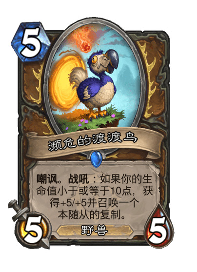嘲讽。战吼:如果你的生命值小于或等于10点,获得+5/+5并召唤一个本随从的复制。
