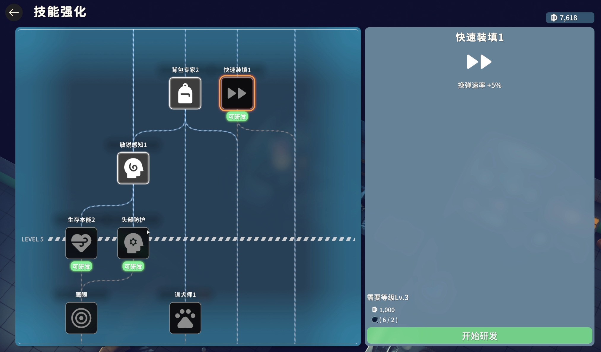 在不少设施中,都有着技能树。玩家通过提交各种特殊的物资,再等待现实生活中足够的时间,便可以解锁新的技能。这些加成都是对玩家的永久BUFF,并不会随着玩家死亡而丢失。也是因此,玩家即便经历一两次战败,也能让角色不断地成长,削弱玩家的负面反馈。