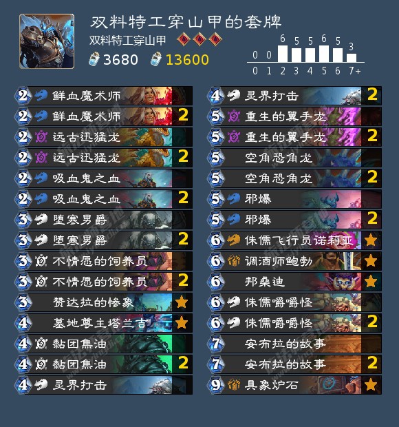 打法解析:调酒师鲍勃尽量用来控场,冰DK因为有很多AOE,而我们这套卡AOE不足,因此尽量主动交换掉自己的杂毛。安布拉的故事可以找的东西有很多比如凯恩·血蹄,莫尔葛熔魔等。
