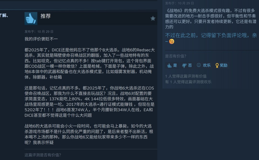 《战地6》大逃杀模式“禁区冲突”现已在昨晚11点和第一赛季同步上线,大逃杀模式为免费游玩。Steam综合评价为“褒贬不一”,在1150篇评价中,只有46%的玩家给出好评。而在中文区,大逃杀模式为多半差评。