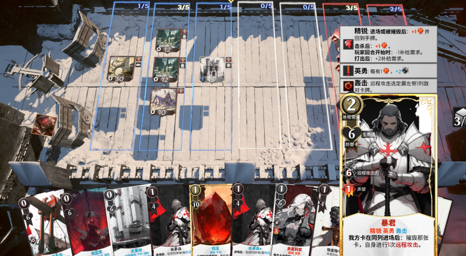 每一条战线都有不同的承载量(战场宽度),玩家在决策时必须要考虑到很多因素,其中就包括了地利,有时候放弃一些前沿阵地,转而在易守难攻的地形派遣重兵把守,从而限制敌方进攻的强度,但是绝大多数单位都只会“存在”一个回合,玩家必须灵活利用不同单位的各项被动进行有效的防守,错误的判断,过早的放置一堆士兵往往会带来灾难性的后果,最小的代价也都是是损失多条战线。