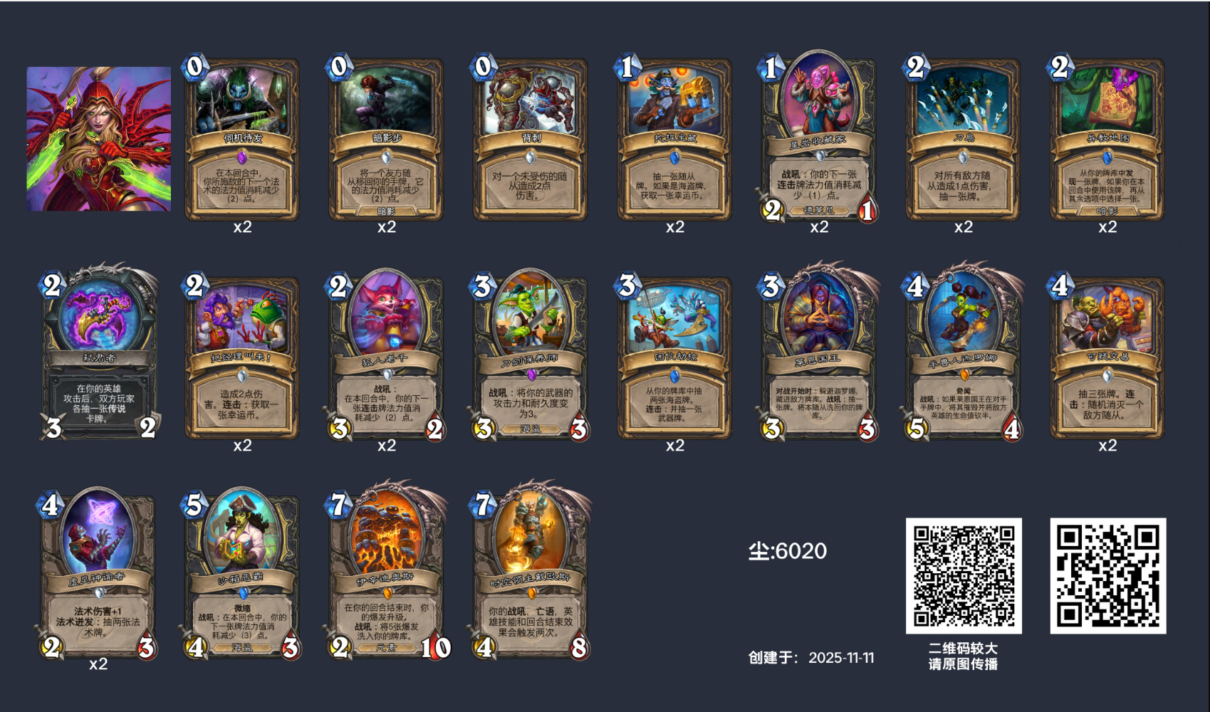 卡组虽然启动很公式,但是很多抉择点需要随战局而变化,前期的节奏过渡非常重要,团队劫掠没有上手的话就得多思考后续的打法,打慢速就多过牌,可疑交易什么的可以直接用,打快攻就尽量控场,狐人老千,迦罗娜可以直接拉上去打架,虚灵配合被刺解场过牌,再暗影步收回来配合刀扇还能解场。