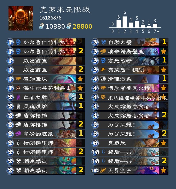 得益于新拓展包时间流巨大补强,战士总算能在挨打活下来了,这套牌也是以57-41(胜率58.2%)的战绩打上传说。只能算勉强能玩。期间并没有多次改动斟酌卡位,有待精炼。