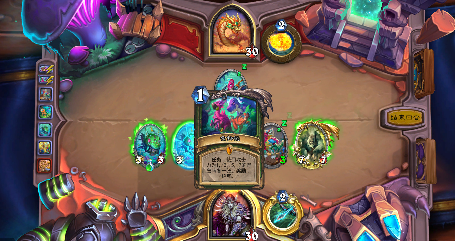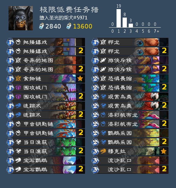 - 3攻随从:当日渔获1费3攻必须满编,观鸟buff后还能补充这套牌最缺的5攻(低费5攻野兽是真的稀缺);漆彩帆布龙 既可以前期稳场面做任务,又可以在开任务后膨胀场面压死对手,本身2费3攻裸下做任务也不算太亏。由于观鸟的存在3攻任务是非常容易完成的,因此笔者没有选择携带拾箭龙鹰。