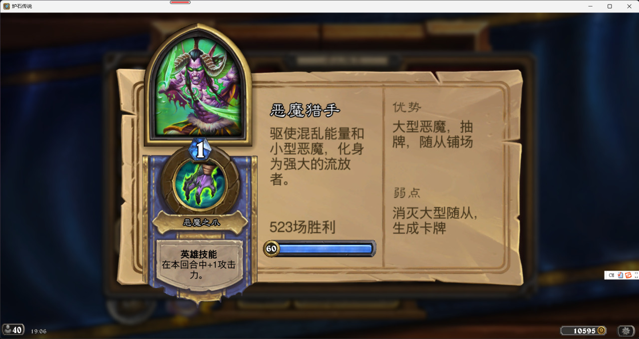奇数瞎(恶魔猎手基础英雄技能升级后效果为1费,在本回合中获得2点攻击力。)低费进攻技能使得卡组思路必然是进攻思路,这方面与低费海盗很是契合,加上一些相关干扰及对策卡,一套朴实无华的节奏中速卡组就出来了,属于玩具卡组。