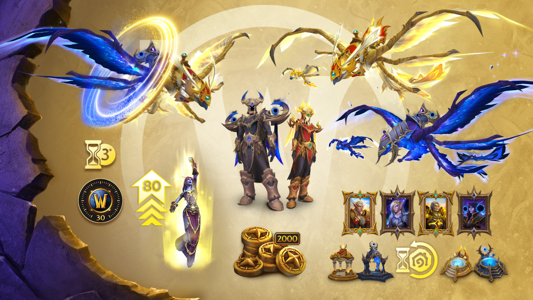 获取踏光行者和踏虚行者幻化套装,光翼和虚翼龙鹰飞行坐骑,末日之羽和翩飞希望龙鹰宠物,额外的商贩标币,以及30天游戏时间。