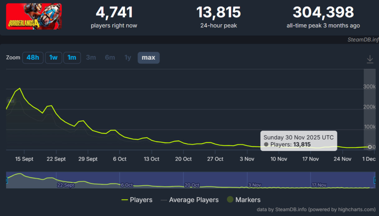 《无主之地4》在Steam平台上的玩家数量急剧下降,发售两个月后Steam活跃玩家数量流失了约96%。这款由Gearbox开发的刷宝射击游戏曾在V社平台创下系列最高记录,但现在却面临着令人担忧的前景。