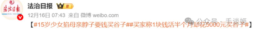 前几天姬在刷微博找素材的时候,刷到了法治日报发的一篇文章,光是看方头括号里面的内容就已经让姬惊呆了——#15岁少女掐母亲脖子要钱买谷子#。