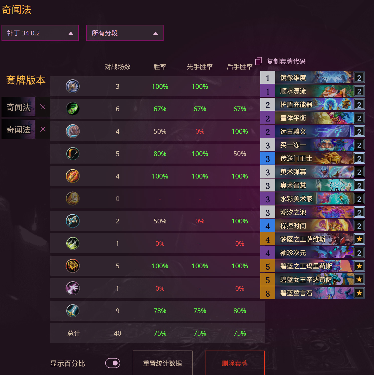 补丁后40局的对局基本上包含了目前环境中的所有卡组,而我们的奇闻龙法,断层的几乎优开所有职业。下面先讲卡组整体思路,再讲对战不同职业的对局思路: