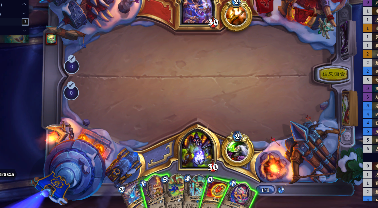可以看到实际上大部分和传统弃牌术的构筑是差不多的,只是抛弃了削弱后的马克扎尔小鬼和臃肿的小鬼骑士,同时为了速写美术家能够稳定抽到灵魂弹幕而放弃了莫瑞甘的灵界(说实话在没有了双小鬼后这套卡组实在是不需要莫瑞甘的灵界了)。续连熵能和超光子弹幕是新版本补充的两张超绝假卡,我们一会来聊。暗石守卫则是在你有满手要弃的牌时的大救星(谁懂468+战吼打12的救赎感),但带两张太过卡手,因此另一张换了牛,用作对策卡位。
