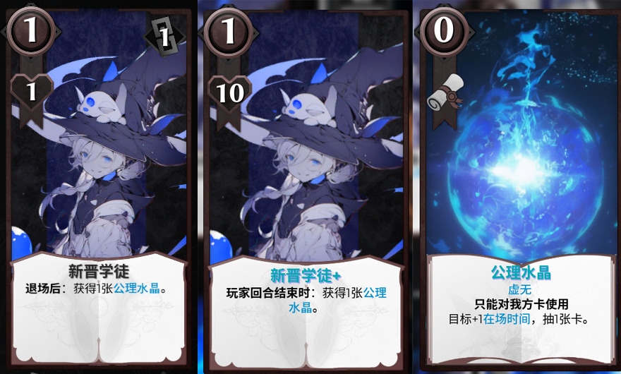 新晋学徒这张卡,升级前退场获得公理水晶,升级后回合结束就能获得,多张新晋学徒形成循环之后,手牌中就会有大量的公理水晶,此时搭配艾米的机制就可以形成反复频繁的高额输出,随便补一些辅助卡解决生存和炮灰的问题即可。