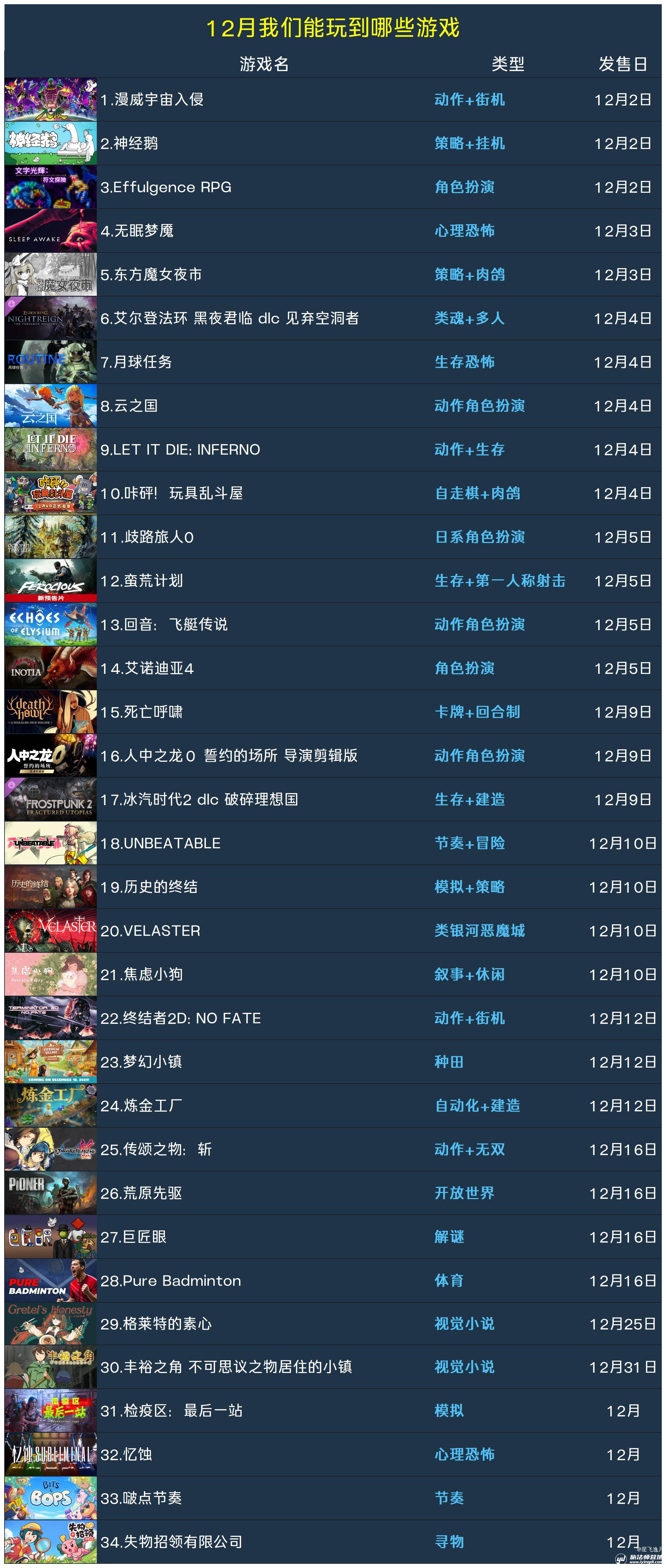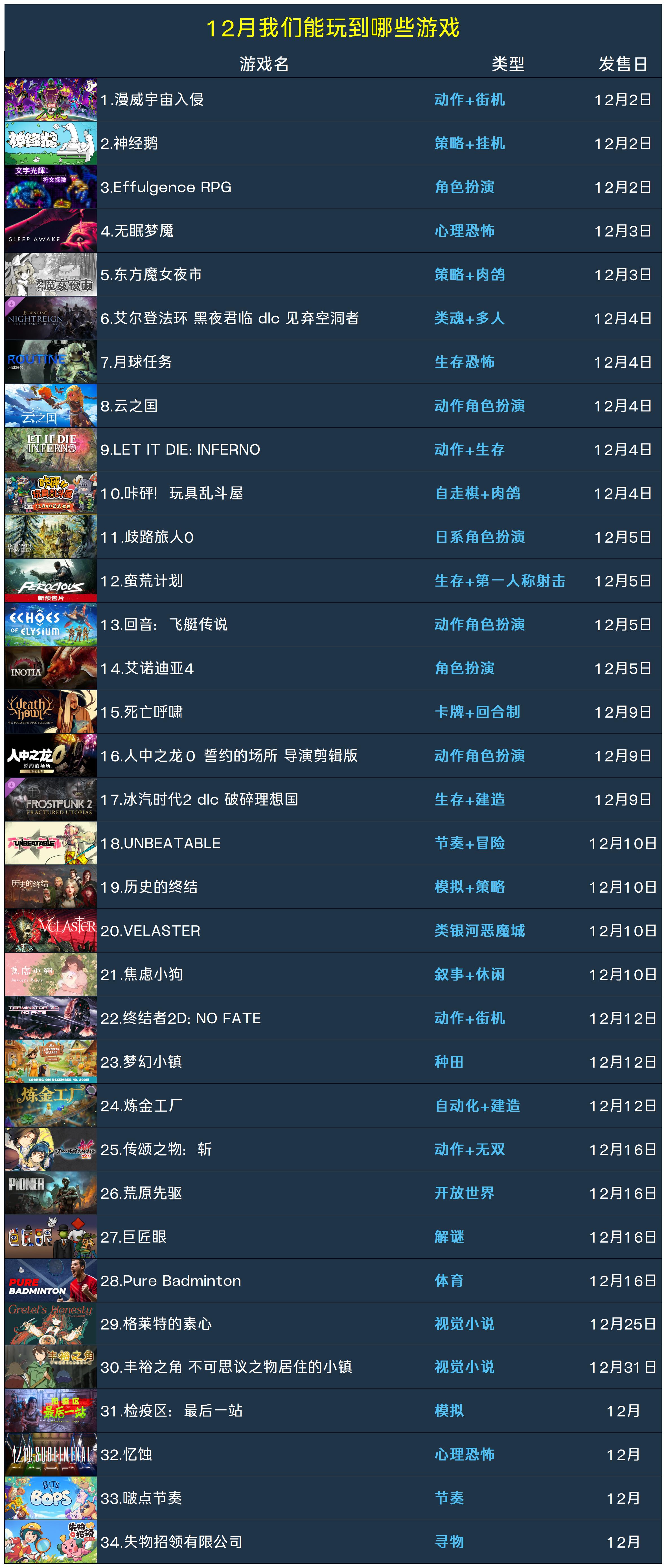 终于到了今年最后一个月了,由于这个月有十多天的冬季大促,所以新作数量并不太多,不过有很多写了2025年发售的游戏一直没公布发售日,我估计大部分都会跳票,仅列出了几个我觉得有可能年内发售的。下面一起来看看有哪些游戏吧
