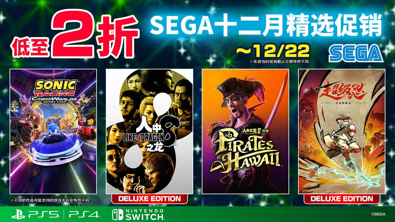 世嘉现正于PlayStation™Store、Nintendo eShop举办“SEGA十二月精选促销”活动,部分PlayStation®5/PlayStation®4/Nintendo Switch™游戏以限时特惠价回馈玩家。本次促销将于2025年12月22日结束。