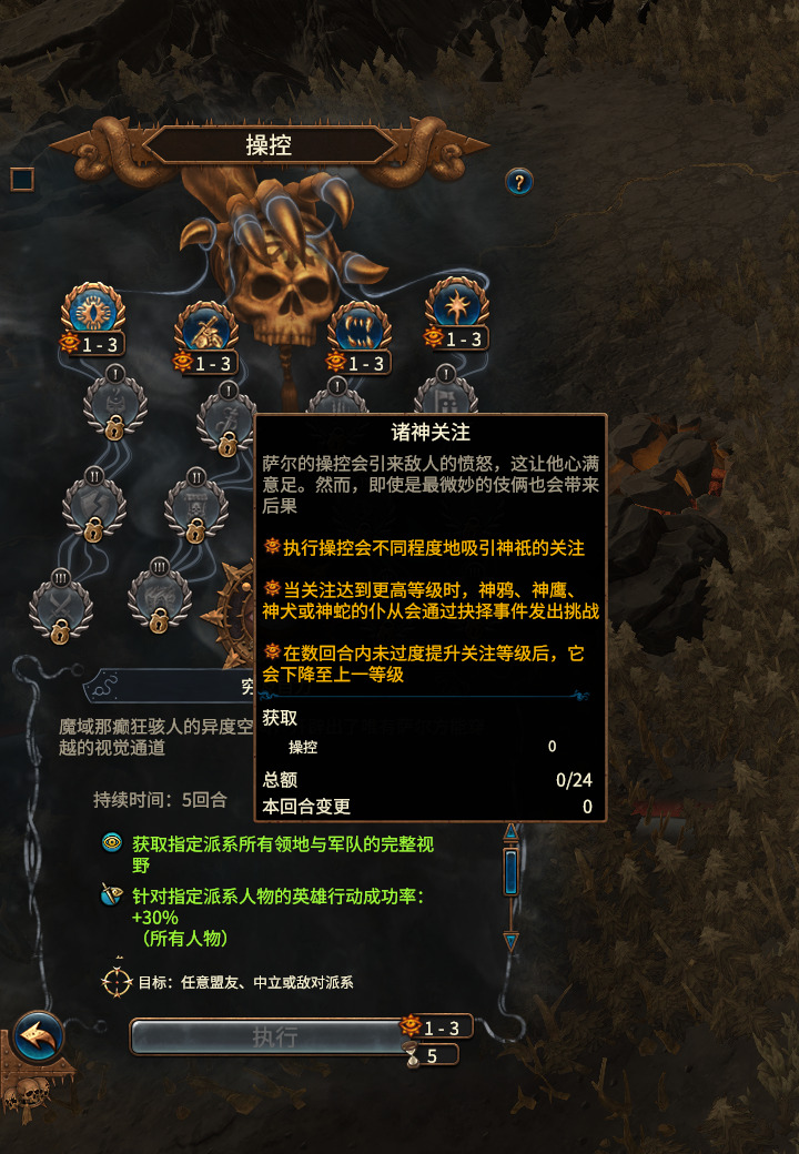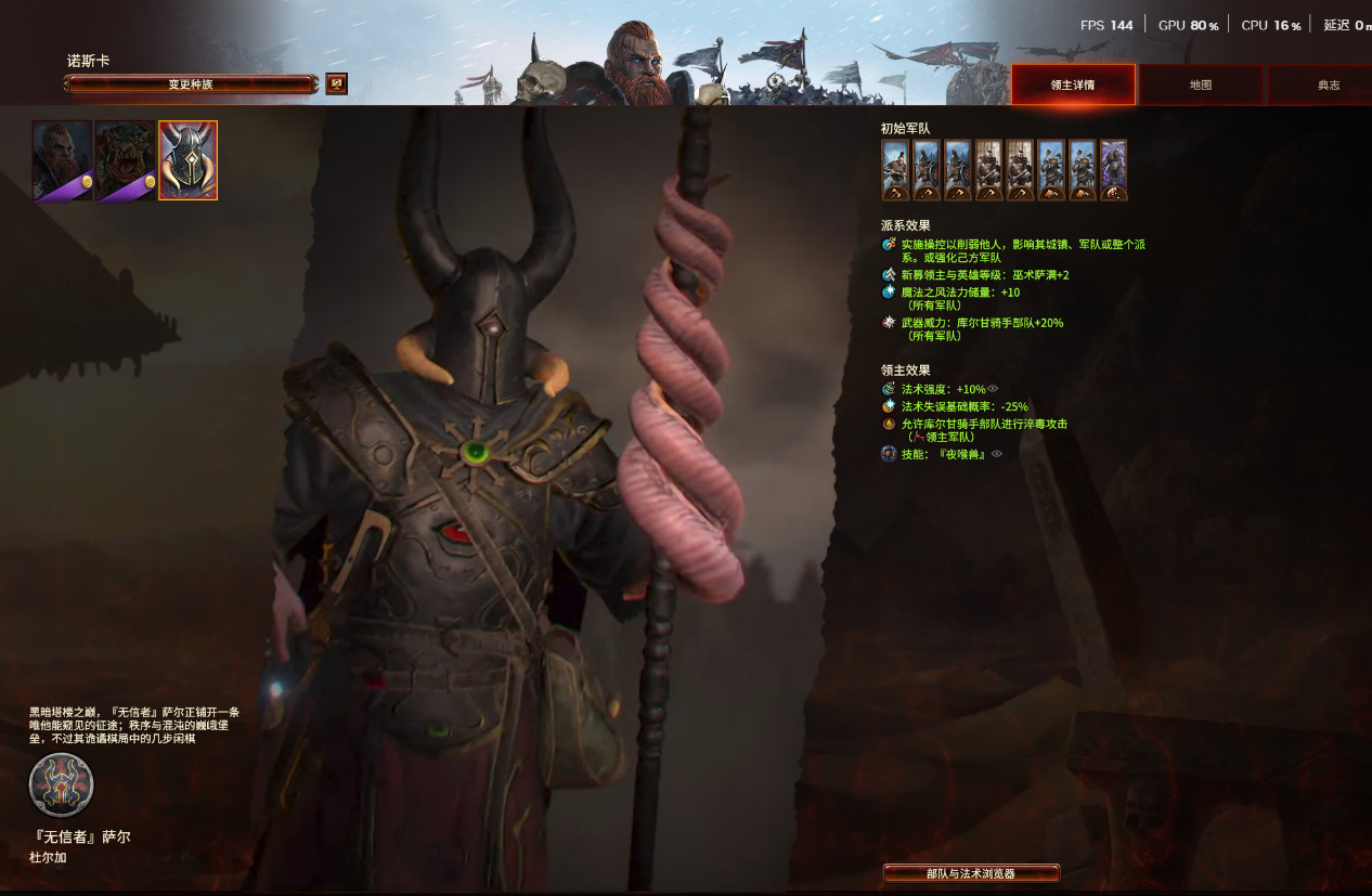 而萨尔在战斗上可以使用“操控”来给你的战斗提升胜率,这个操作会给你提供一些各种方面的增益buff,无论盟友,中立或敌对派系都可以使用。还有背叛行动的能力,这种能力可以在战略地图上通过破坏后勤和外交的方式去消弱敌人,其中还有一个“treacheries”的系统,系统内的提示和教程都是白色,这个系统是类似于cult和undercity机制,但是更加鼓励战令定居点去传播背叛。同时他的献祭召唤机制也十分有趣,通过牺牲自己的部队单位去召唤强大的恶魔军团。