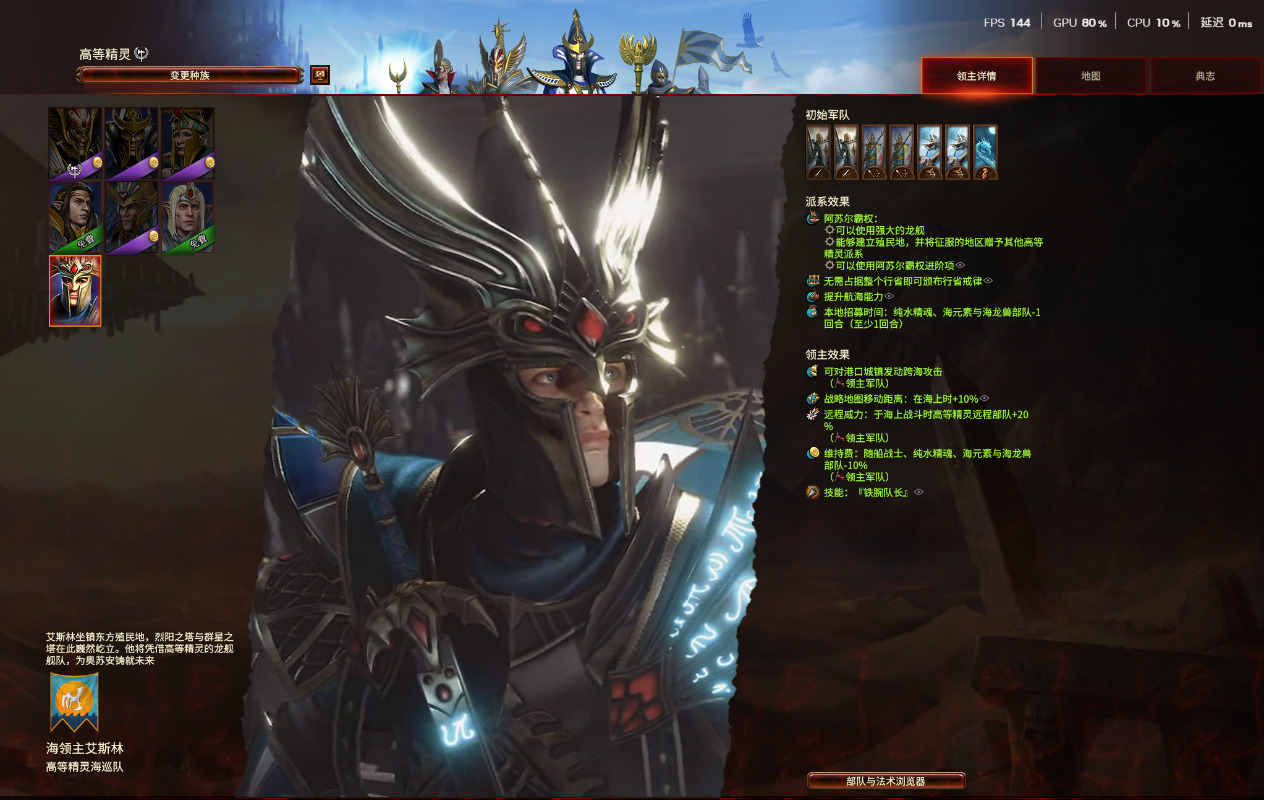 海领主艾斯林的玩法与上面两位不同,他的“精灵殖民地”机制让他的定位似乎更加偏向一个海盗的劫掠的角色,正如他的阵营高等精灵海巡队,他的发展更多是在他的龙舰上,而殖民地更多是作为一个源源不断产生经济的机制,他的主场大部分是在自己的龙舰之上。并且由于殖民地的机制,他可以直接占领的城镇较少,更多则是劫掠敌对阵营获得经济,或者攻陷城镇并交给同在高等精灵阵营的其他角色,并在城镇中建立海巡队哨站。