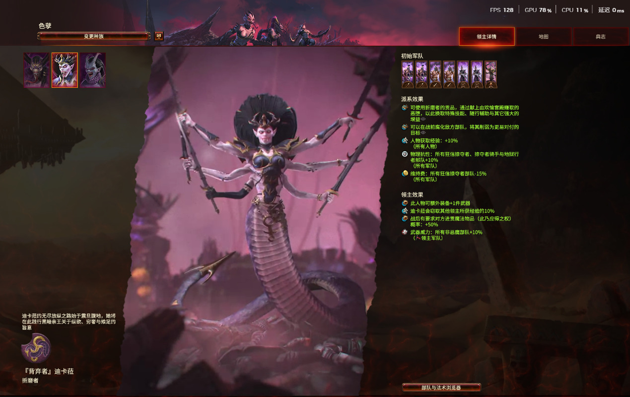 首先是【背弃者】迪卡菈,她的派系效果在色孽中算是非常特殊的,她有特殊的奴工系统,而奴工则依仗你不断的攻城略地建造奴工营地来产生或劫掠城镇来补充。奴工是你进行游戏时的重要资源。我们占领城镇后,可以建造三种特殊建筑:奴工营地、折磨者城塞与你的主要城镇可用建筑欢愉宫殿。