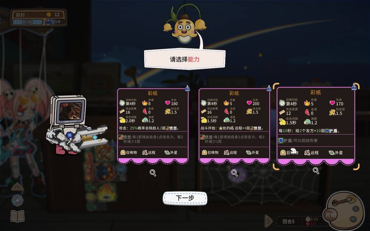 另外,由于采用了召唤物-道具并行的设计,本作还引入了重量条限制玩家大量堆砌生物,并通过气球等道具扩大其上限。一旦携带的重量超标,召唤物登场时就会携带各种负面词条,且超标越多,负面效果越重。