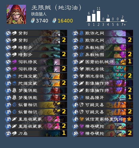 双职业乱斗 无限猎(贼)的无限发现操作玩起来有点爽,打了将近100把,胜率高达80%,可惜乱斗结束了,再也体会不到了。后来戒断反应导致有点手痒难耐,于是尝试复刻无限贼(猎)。从猎人角度,想过带翡翠梦境的0费梦境回手,但不能减费,不如暗影步一根,于是果断转贼,只需要搞到猎人的游侠斥候就行了,于是锁定到了232影像操作师,还有似曾相识和梦魇供能(打猎人偷斥候),于是这套卡组就诞生了。