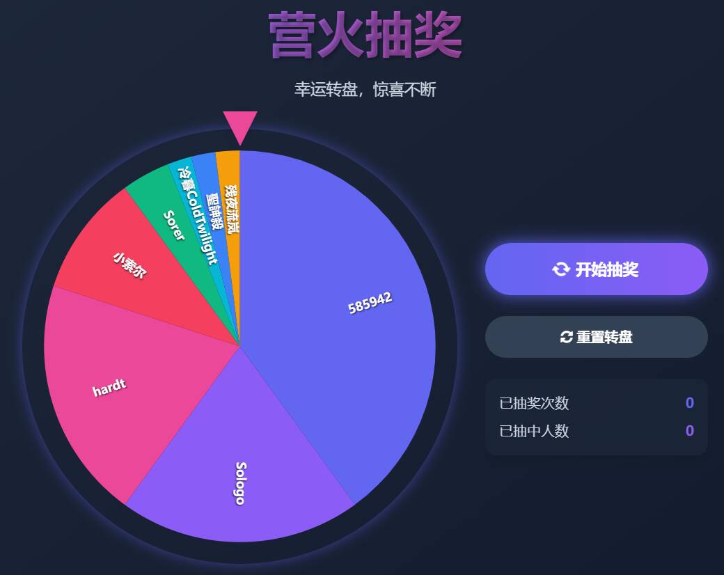 举例说明:张三打赏了500营火,李四和其他人打赏100营火,那么转盘如下,等于打赏多会增加你中奖的机会,但是并不能保证一定会中。