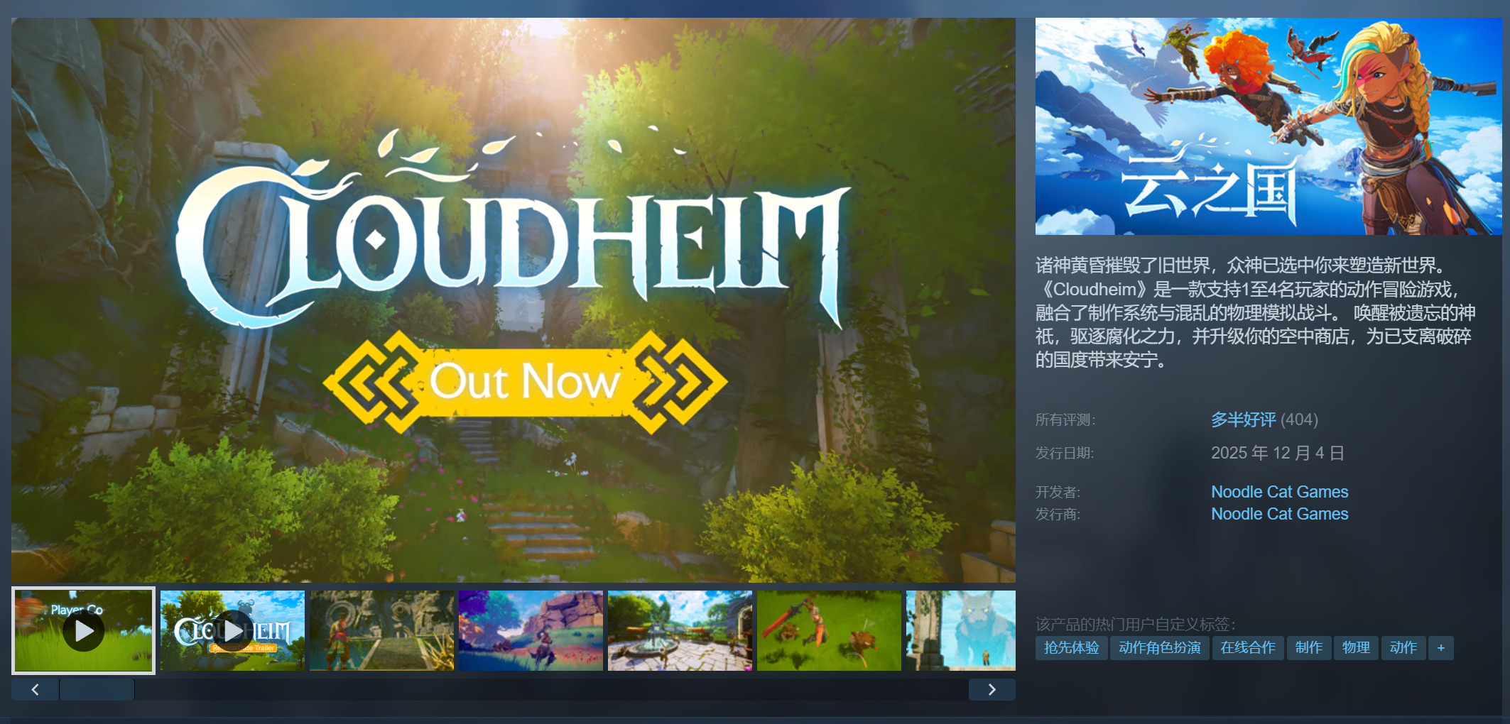 《云之国》是一款由Noodle Cat Games开发的开放世界动作角色扮演游戏。该工作室由前Epic Games等公司的资深开发人员创立。游戏已于2025年12月4日在Steam平台以抢先体验模式发售,国区首发价格为97元。