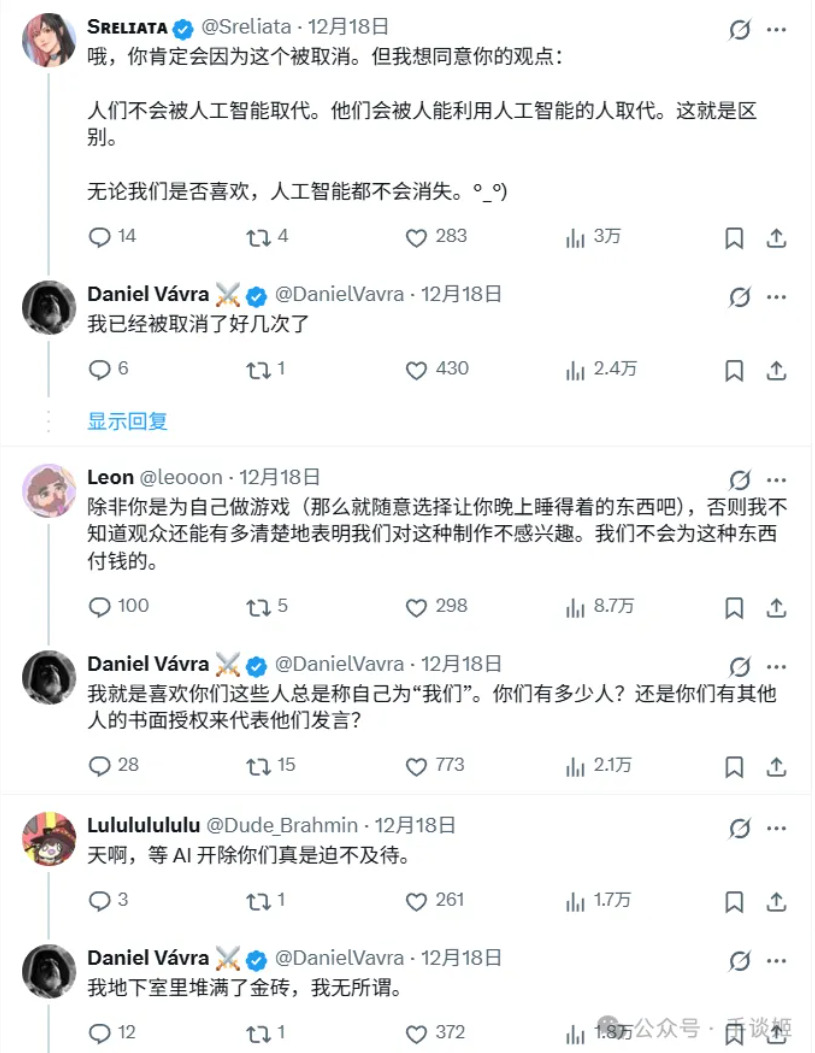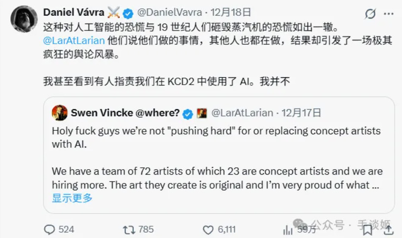 当然,像拉瑞安这样想的开发厂商也不在少数。在这场AI风波中,战马工作室创始人、《天国:拯救》系列创意总监丹尼尔·瓦夫拉就站了出来公开声援拉瑞安。