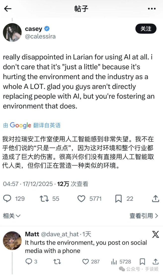 此言一出,立刻在玩家中激起轩然大波。不少玩家纷纷拍桌,大呼拉瑞安你这样一个浓眉大眼的开发商,怎么也开始叛变革命用起AI了?在舆论压力持续升温的情况下,拉瑞安工作室随后不得不发布声明进行澄清,强调AI的使用仅限于游戏开发阶段,用于辅助内部流程,而在正式发售的游戏内容中,并不会包含任何由AI直接生成的元素。