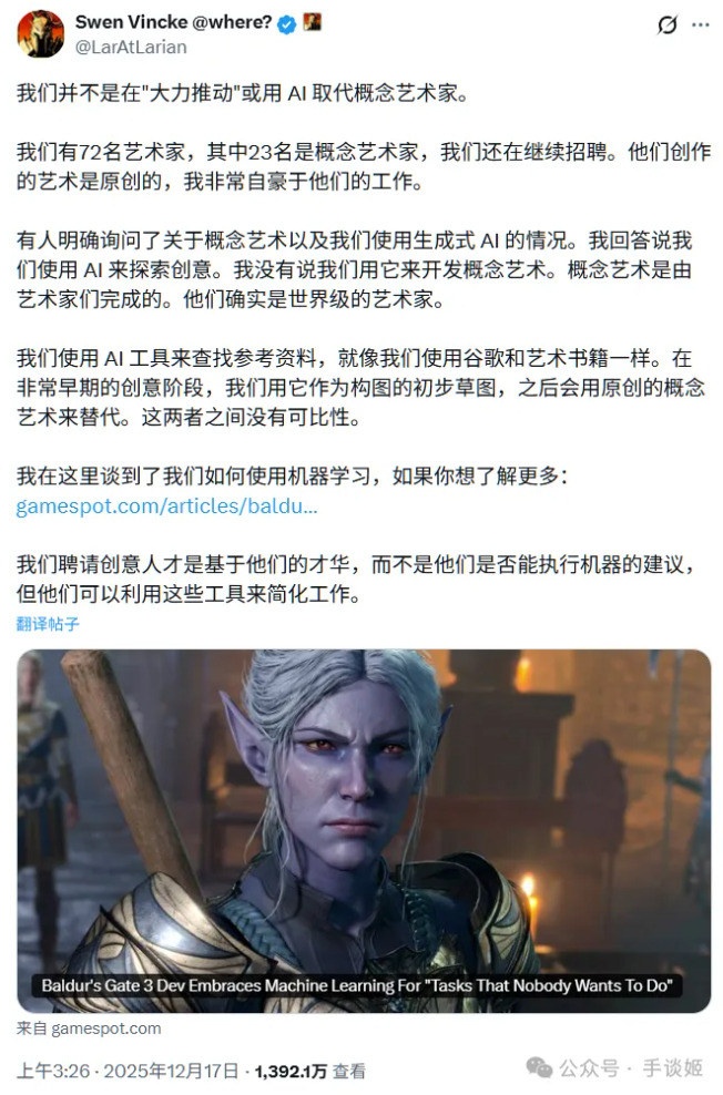 就比如开发凭借《博德之门3》一举斩获TGA年度游戏的拉瑞安工作室。其首席执行官SwenVincke就在与彭博社的采访中,承认拉瑞安正在“大力推动”生成式AI的应用,尽管目前尚未带来显著的效率提升。具体而言,生成式AI主要被用于探索创意方向、完善PPT、开发概念艺术,以及撰写用于过渡阶段的占位文本。