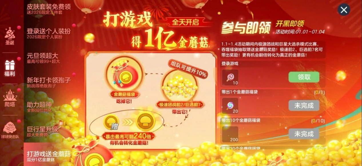 1月1日至1月4日,参与游戏即可掉落金蘑菇,组队游戏还可额外提升10%获取率!与球搭子组队,共同瓜分这场泼天富贵。