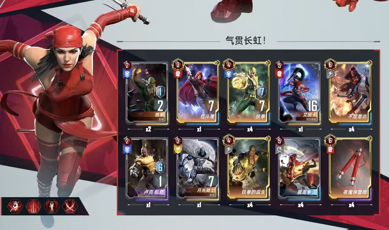 五回合及以后:在五本搜牌即可,死侍和铁拳先拿一张,2099尽量多拿,艾丽卡(咫尺地狱)见了就拿(扭曲的话别涨到7块钱及以上都能接受,利用艾丽卡快速刷出四星铁拳,前期战力很强。