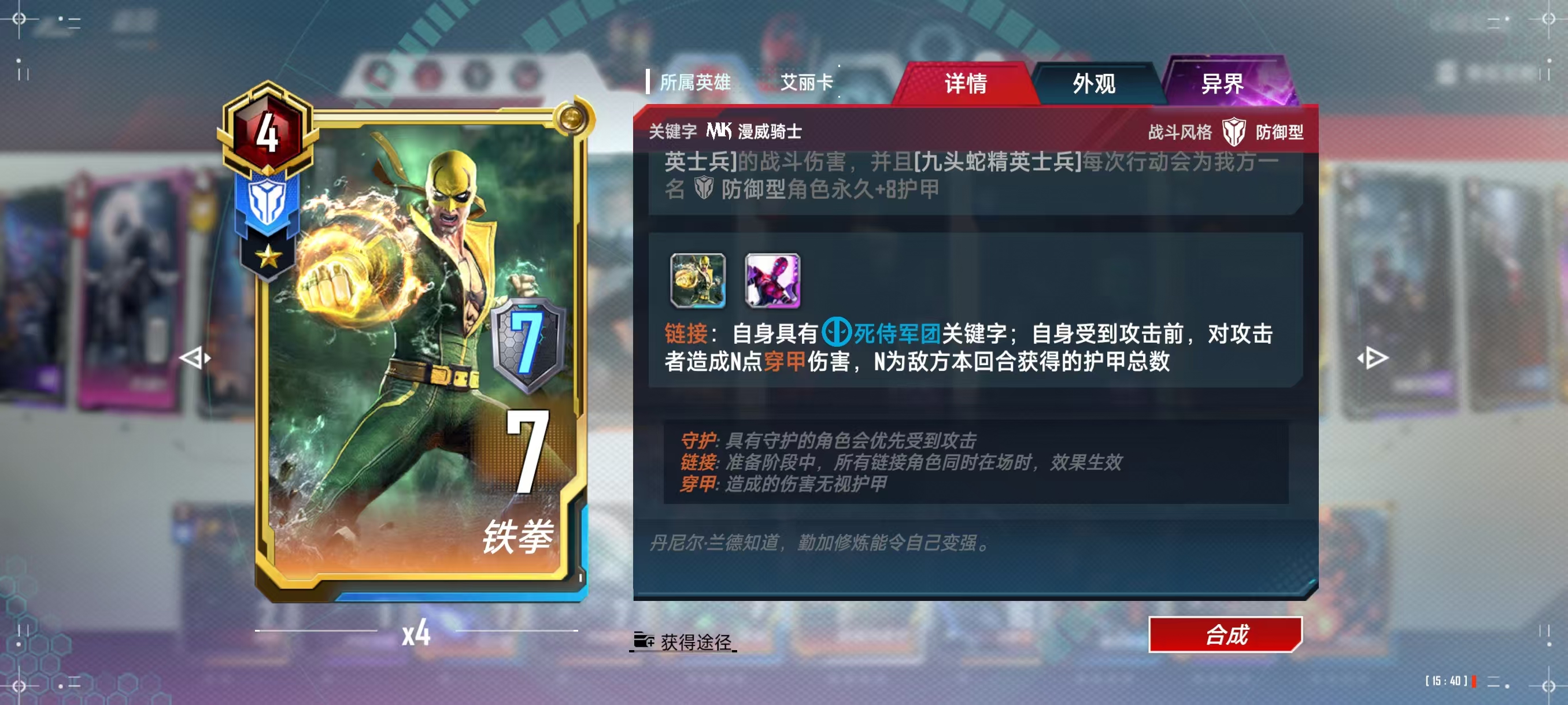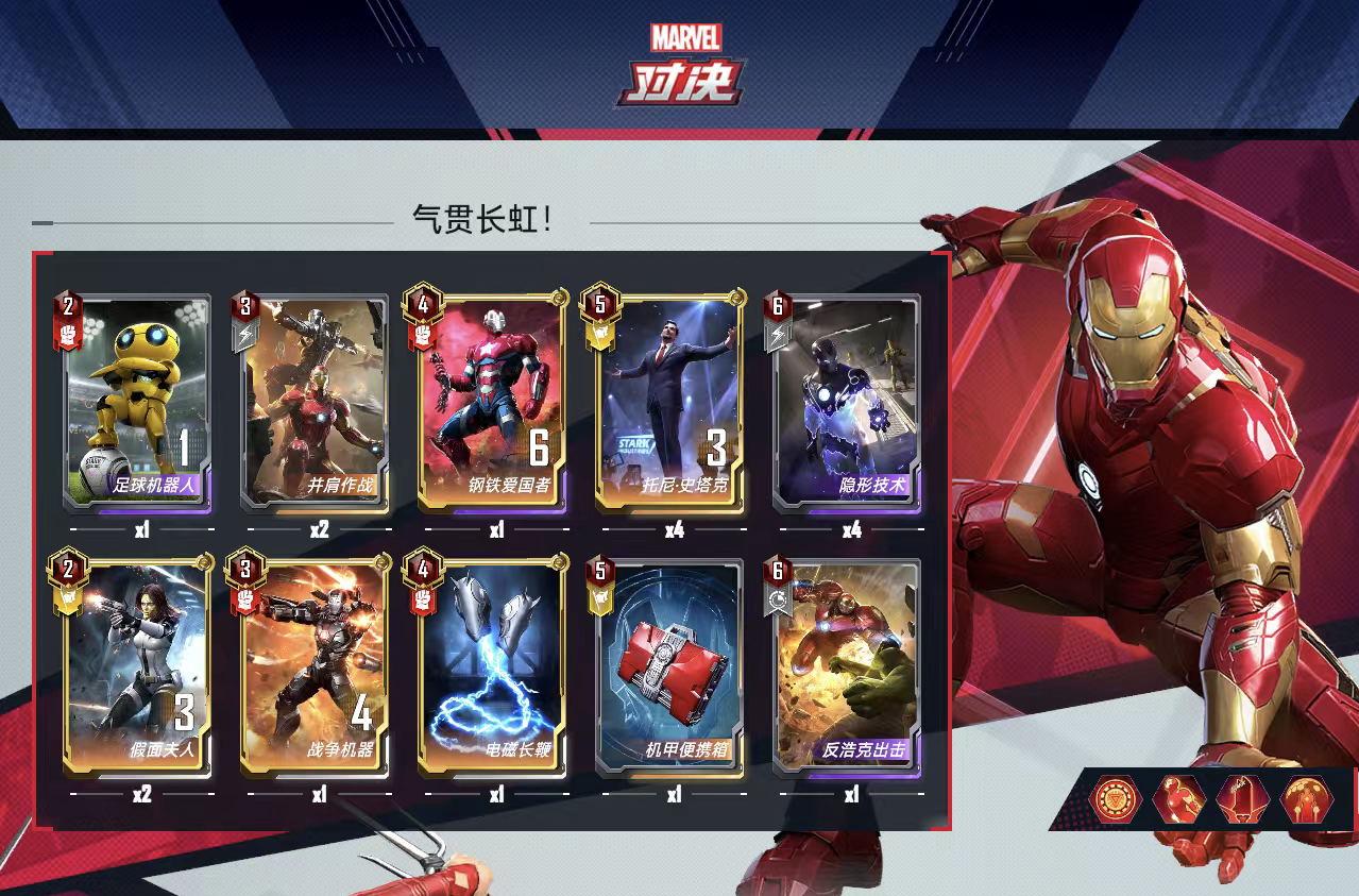 铁拳,卡组核心,可以在对方攻击前对其造成穿甲伤害,配合2099的战力转护甲可以快速消灭战力不够高的角色,主要用途是一击摧毁成百上千护甲的尚气