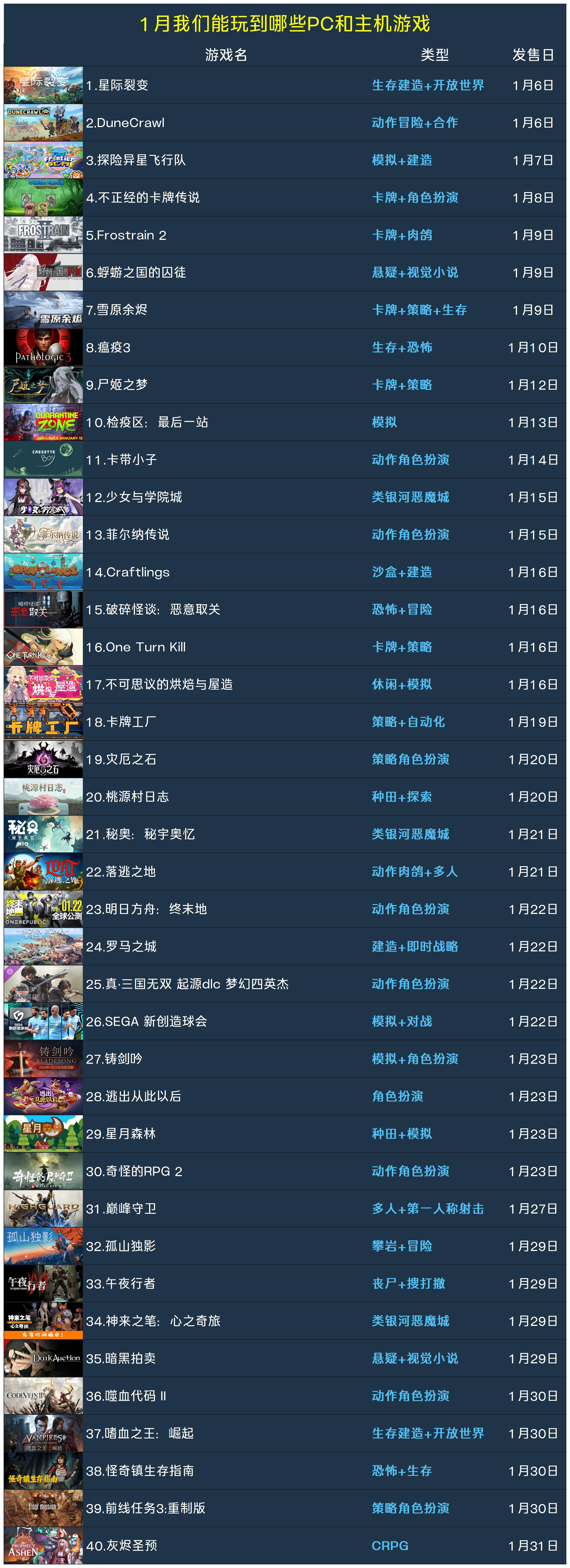 今年虽然是游戏大年,但是1月份的游戏并不算太多,大家可以趁着这个月玩一玩之前还没来得及消化完的游戏。下面一起来看看有哪些游戏吧