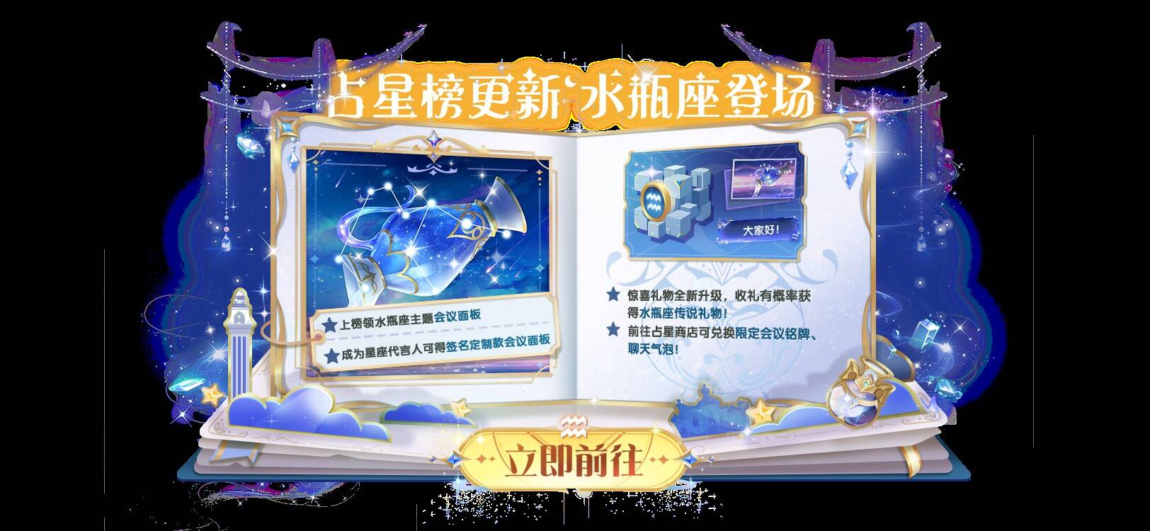 神秘【水瓶座】占星阁璀璨开放!参与转盘并完成赠礼任务获取占星石,可兑换传说星座礼物、星座星环、聊天气泡等稀有收藏品。成为星座代言人可获得签名定制款会议面板,尽享专属星座奖励。
