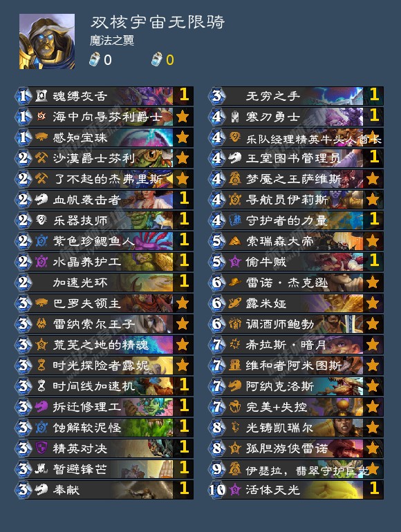 而且不仅是回来了这么简单,这一张武器直接催生了骑士的2套斩杀路线,并且非常契合宇宙骑,于是围绕这两套otk再加上自己的一些思路,我重新构筑了这套双核宇宙无限骑,由于之前已经用邪能辖打上了传说,所以卡组是在传说分段测试的,随着不断的完善,最终我用这套卡组打出了传说分段22连胜的战绩,这里面包括星界德、爆牌德、偶数萨、剽窃贼、类星体贼、弃牌术、蛋蛋术、暗牧、宇宙牧、宇宙DK、宇宙法。