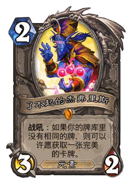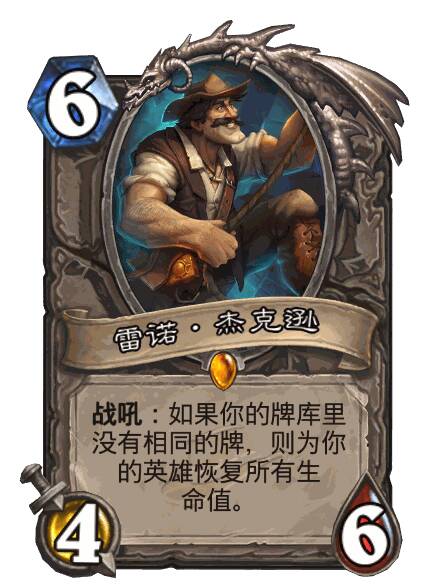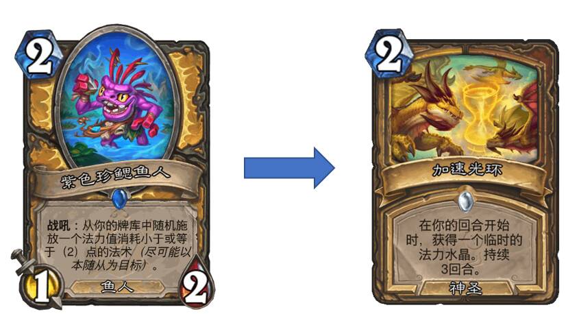 卡组特化构筑2费法术只有加速光环,可以被紫色珍鳃鱼人定向检索,是卡组的超强润滑剂 。2费时无论是直接打出还是鱼人拉出都是超强节奏牌,下几个回合直接4,5,6。尤其是遇到快攻时,这一点的水晶优势非常重要,我们能提前一回合打出雷诺等控场或回血牌,让对面直接熄火。