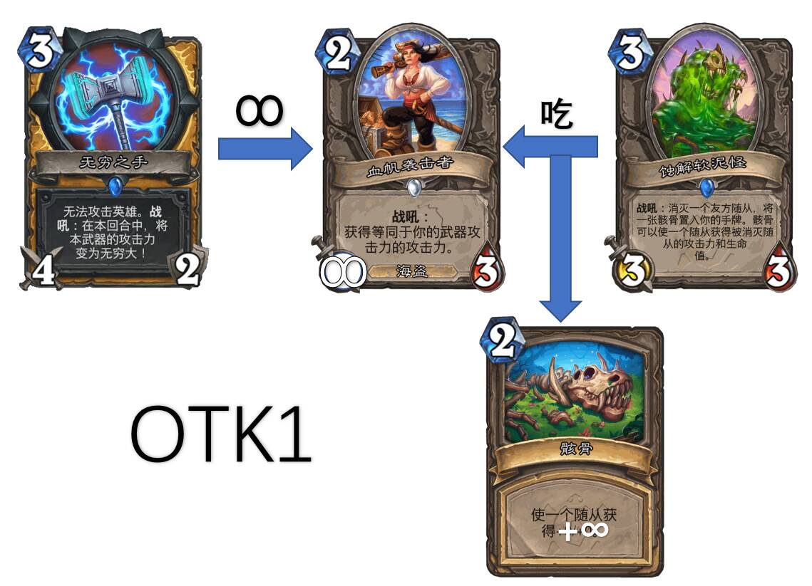先上无穷之手,然后下血帆袭击者获得无限攻击力,然后下蚀解软泥怪获得2费+无穷攻击力的法术,最后随便给一个能动的随从完成斩杀。(ps:这里要是站不住场的话,我加入了寒刃勇士增加容错,或者可以用沙漠爵士芬利发现死骑技能,召唤冲锋怪)