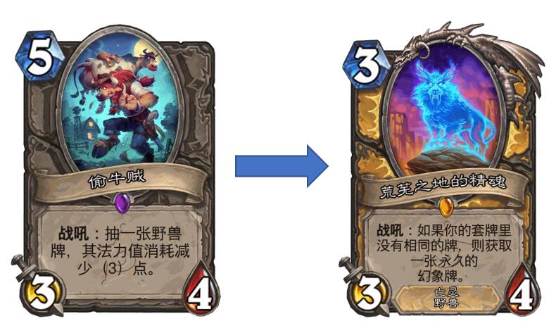 卡组特化野兽只有荒芜之地的惊魂,可以被偷牛贼定向检索,超完美combo,5费直接打出精魂效果和2个34站场。