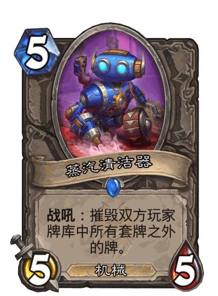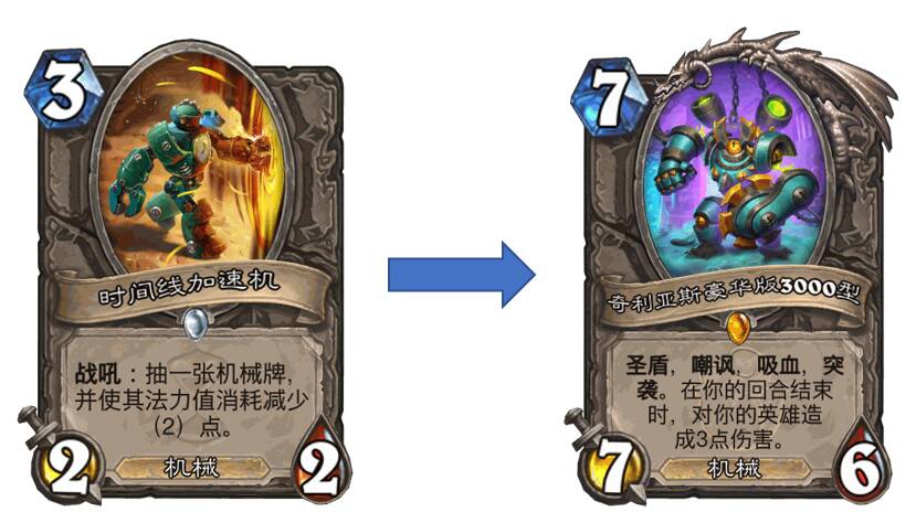 卡组特化机械只有奇利亚斯豪华版3000型,可以被时间线加速机定向抽取,是快攻卡组的噩梦,一个5费的7攻圣盾突袭吸血嘲讽是对付任何快攻卡组的利器。