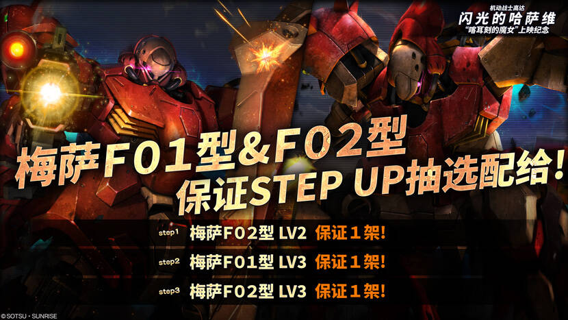 活动期间内,将以每周为单位,举办『闪光的哈萨维』中登场机体的STEP UP抽选配给!