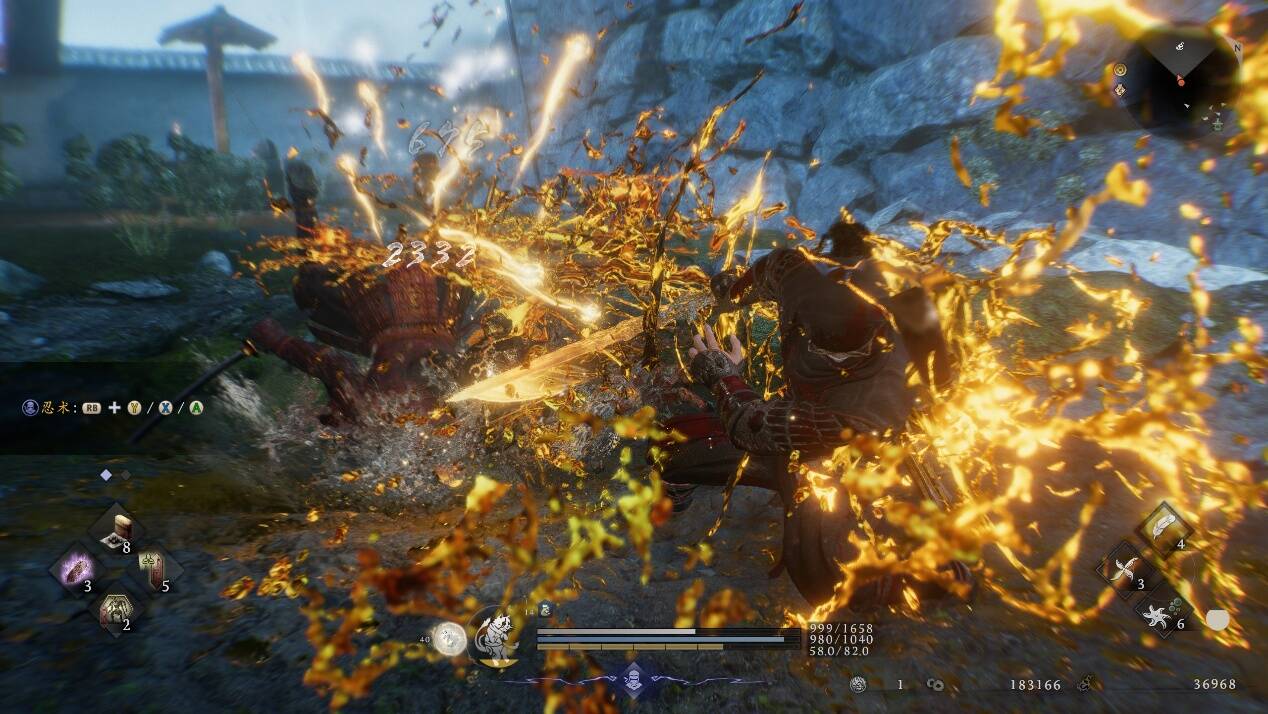 而全新的忍者形态,则去除了流转,转而直接在连段后提供免费的腾挪能力”霞“进行直接偷费,并获得了大量具有各异效果的忍术。同理,忍术条也依靠打击、闪避等动作进行积累。实际上,忍者模式的设计相当接近如今较为大众化的动作游戏的普遍结构:玩家需要掌握进攻的节奏,控制体力条的消耗完成战斗。而这,客观上解决了《仁王》系列一贯的上手难度问题。在访谈中,制作人多次强调,并不指导玩家依托某种形态通关,这意味着《仁王3》终于存在了更通俗的,甚至是”凡庸“的通关路线。