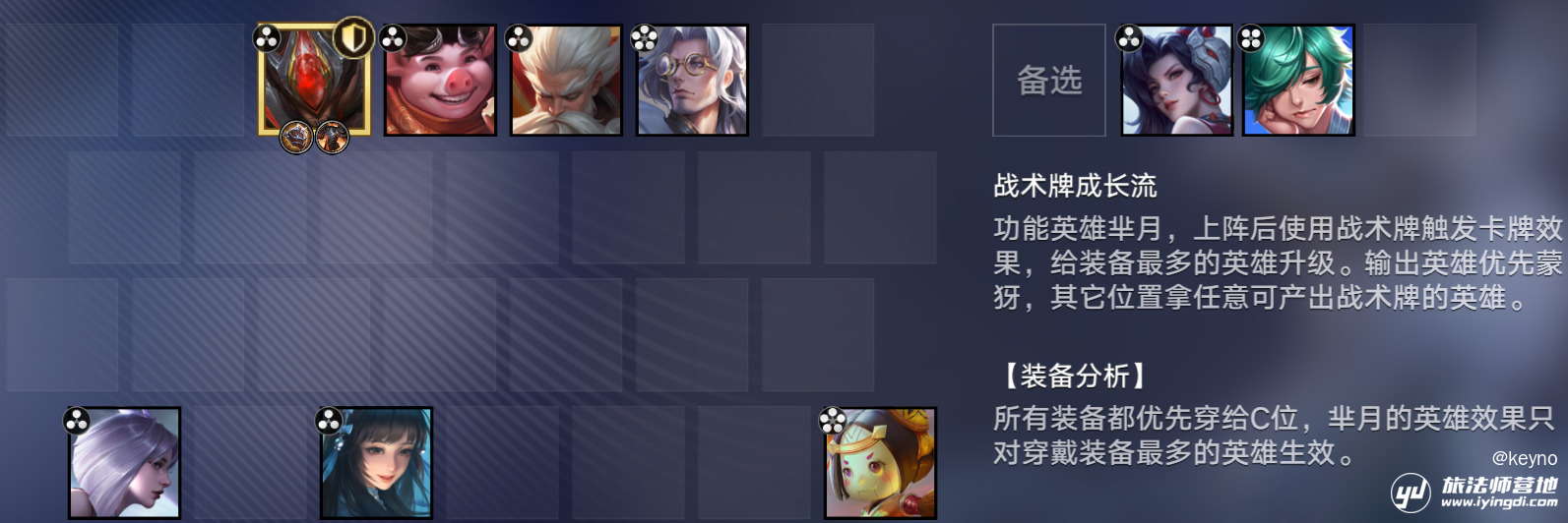 本套阵容前期以「曜」为输出点,适合的装备全给曜就行,可以一直买曜升级,直到阵容成型,将「曜」等级继承后出售,在位置不够时腾出位置给其他核心。后期大核为「鲁班大师」的高等级的机器人,切后排有镜(记得给装备),前排抗伤有很硬的「老夫子」(技能有45%的伤害减免和回血),以及各种强力战术牌给的buff。