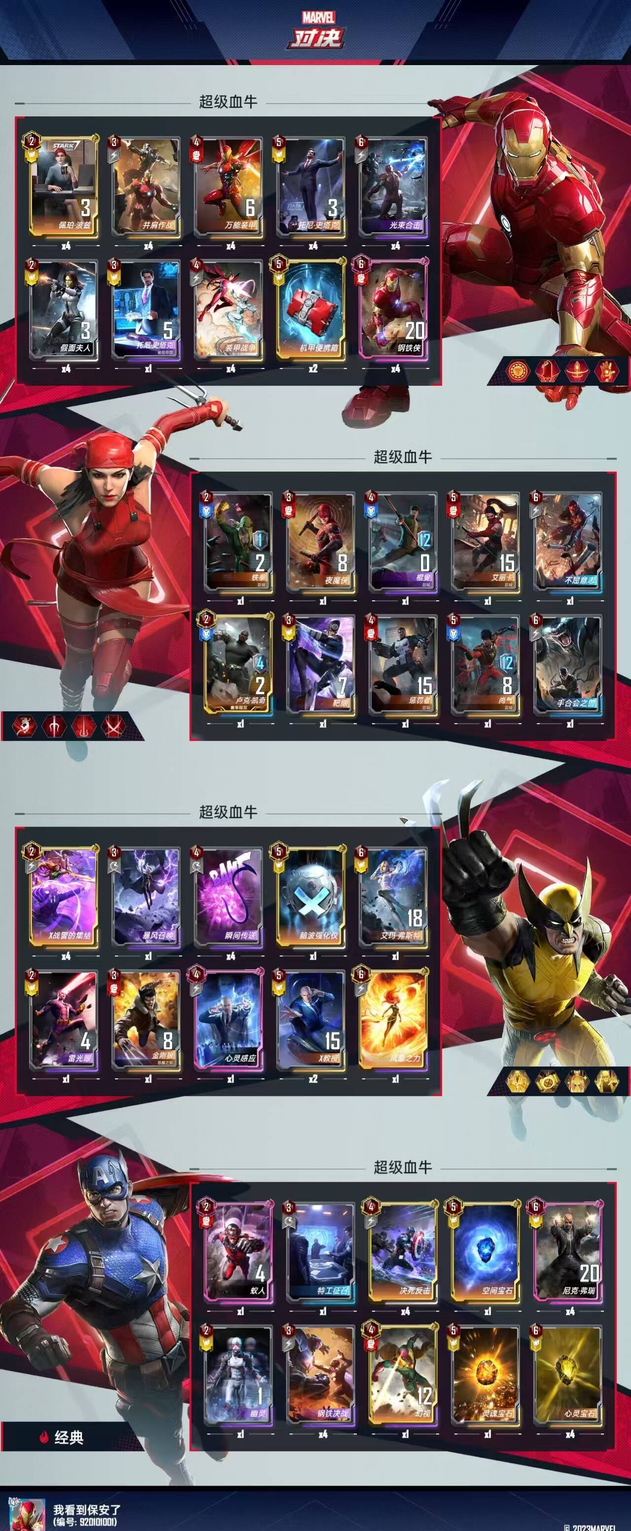 大家好!我是天机特工队的、热心人帅姑娘爱、451天用援军上三万分 、23局胜率95%王者、第四届猫树杯现金大奖赛第五名、牌友口中的‘技术不咋的分还挺高的’的漫威常青树、直播酣睡者、陷阱之王、是兄弟就砍我五刀的我看到保安了。玩了一年多的各类援军卡组,在“是兄弟就砍我五刀”(4链援军黄钢链接砍2次、罗德砍2次、绝境砍1次)的无奈下,今天为大家推荐兼具上分、娱乐效果的超级血牛卡组——“X终幕转钢铁侠”,欢迎大家测试,继续开发出新思路。