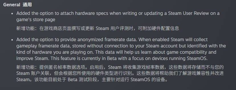 除了评论显示硬件规格外,本次更新还加入匿名化帧率信息选项,启用后Steam会在游戏过程收集帧率数据,但不会与个人Steam帐号绑定,而是与使用中的硬件类型关联。Valve表示,这些数据将用于分析游戏兼容性与效能表现,协助改进平台体验,该功能仍在Beta阶段。