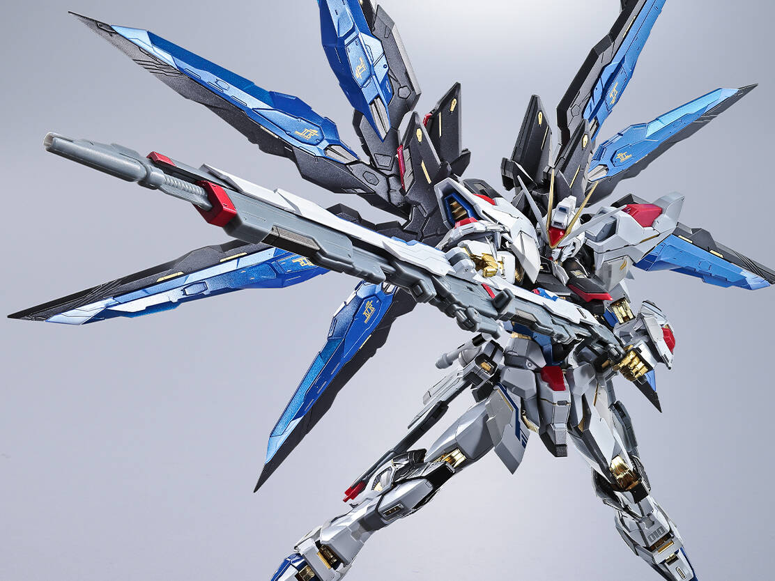 METAL BUILDストライクフリーダムガンダムが再登場!高い評価を受け続けているデザインアレンジに加え、塗装による完成品ならではの質感、電解メッキでの金色の関節が、圧倒的な存在感を演出する。