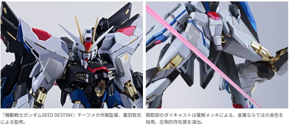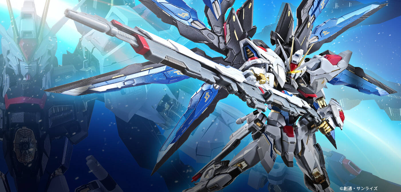 豪華クリエイター陣により生み出された、造型/ギミック/彩色に至るまで細部まで練り込まれたストライクフリーダムガンダム。金属関節には電解メッキを使用し、圧倒的な質感と存在感を生み出す。