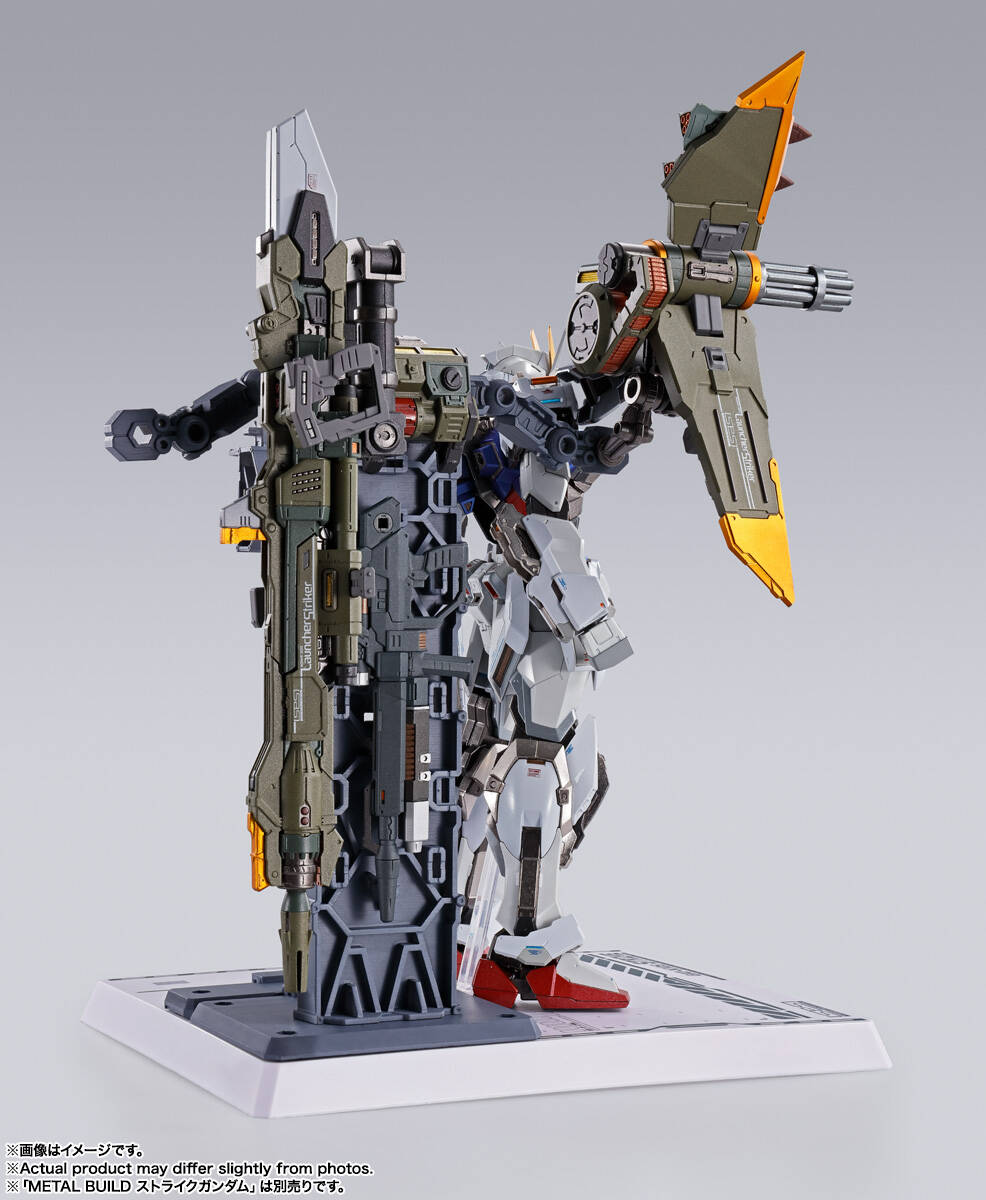 メイン武装「アグニ」は、砲身展開ギミックにより砲撃時をイメージした迫力のボリュームに拡大。肩のコンボウェポンポッドには、クルーズミサイルやビームサーベルを搭載。シールド部を再構成して腕部に装備する事もでき、多彩な武装形態を展開できる。別売りの「ソードストライカー」「エールストライカー」の懸架に対応したスタンドパーツで「ストライクガンダム」とのディスプレイが可能。また2本のランチャーを装備した形態など様々なバリエーションを楽しむことができる。「METAL BUILD ストライクガンダム」シリーズ(別売り)への装着は勿論、「METAL BUILD ガンダムアストレイ」シリーズ(別売り)にも装着可能。