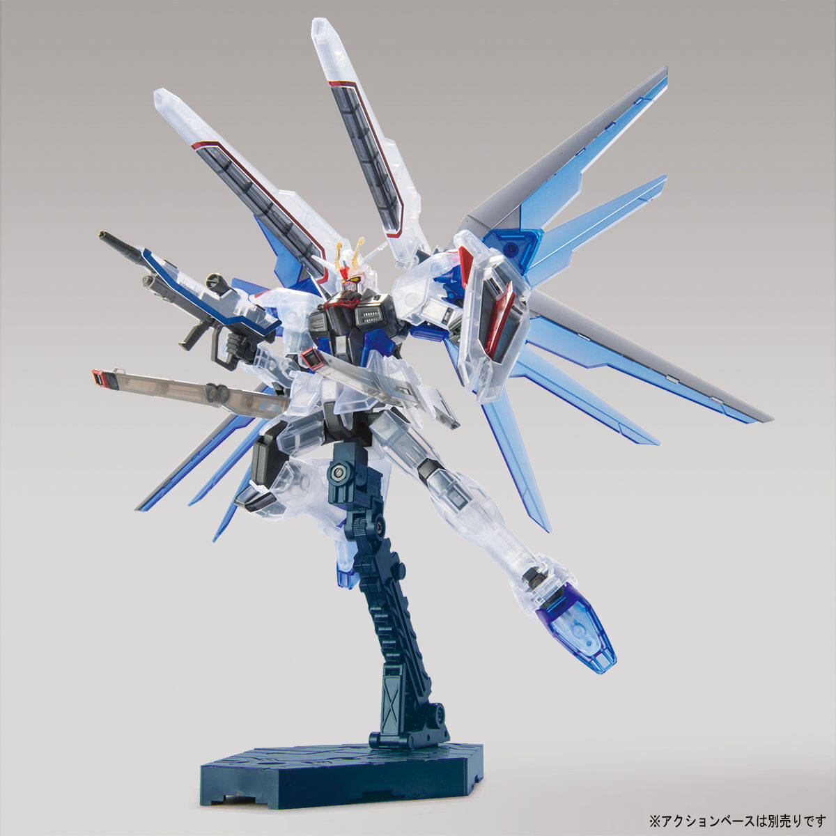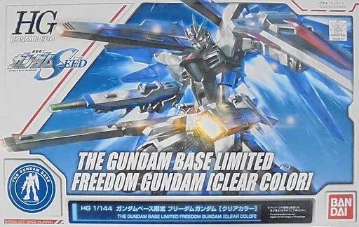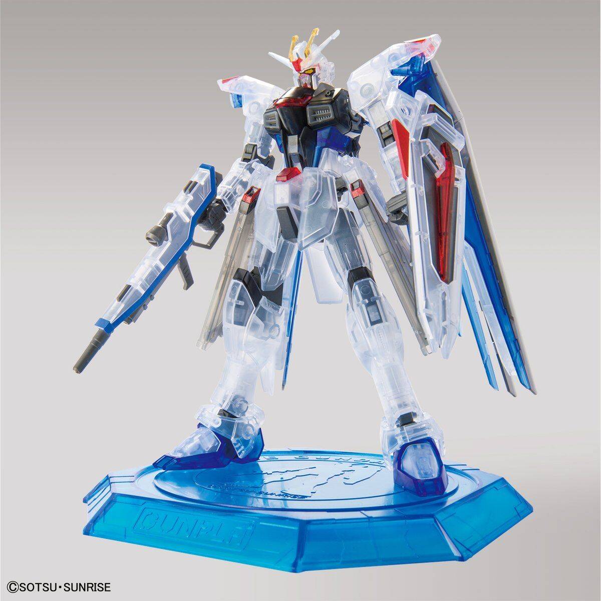 ハイグレード フリーダムガンダムが、ガンダムベース限定クリアカラーで登場。ガンダムベースのロゴがデザインされた、オリジナルのディスプレイ台座が付属。