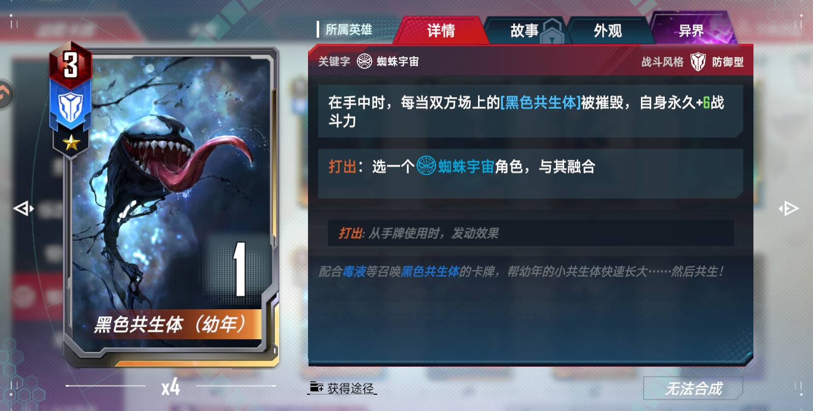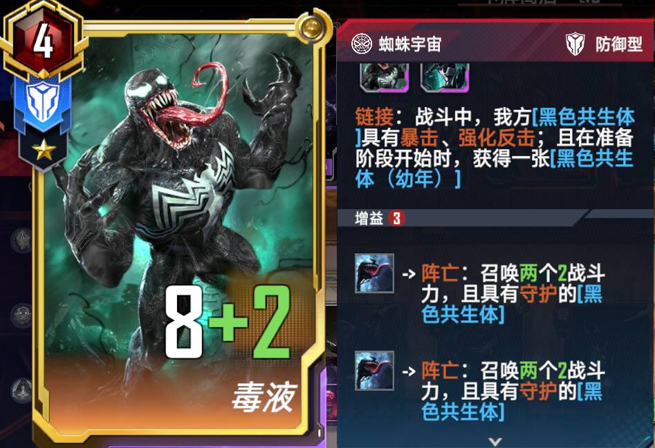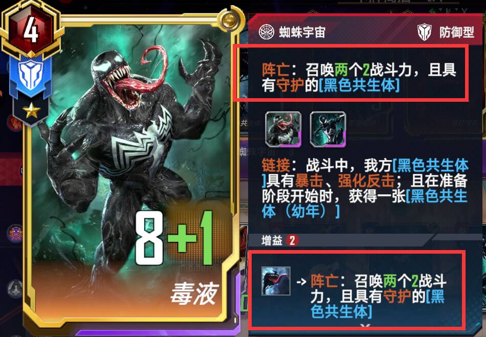 相当于和其他普通蜘蛛卡一样,比如下图,后打出二星小黑子,融合的亡语就是:召唤4个战力4的黑色共生体。融合后的星级还是和初始1星小黑子一样。
