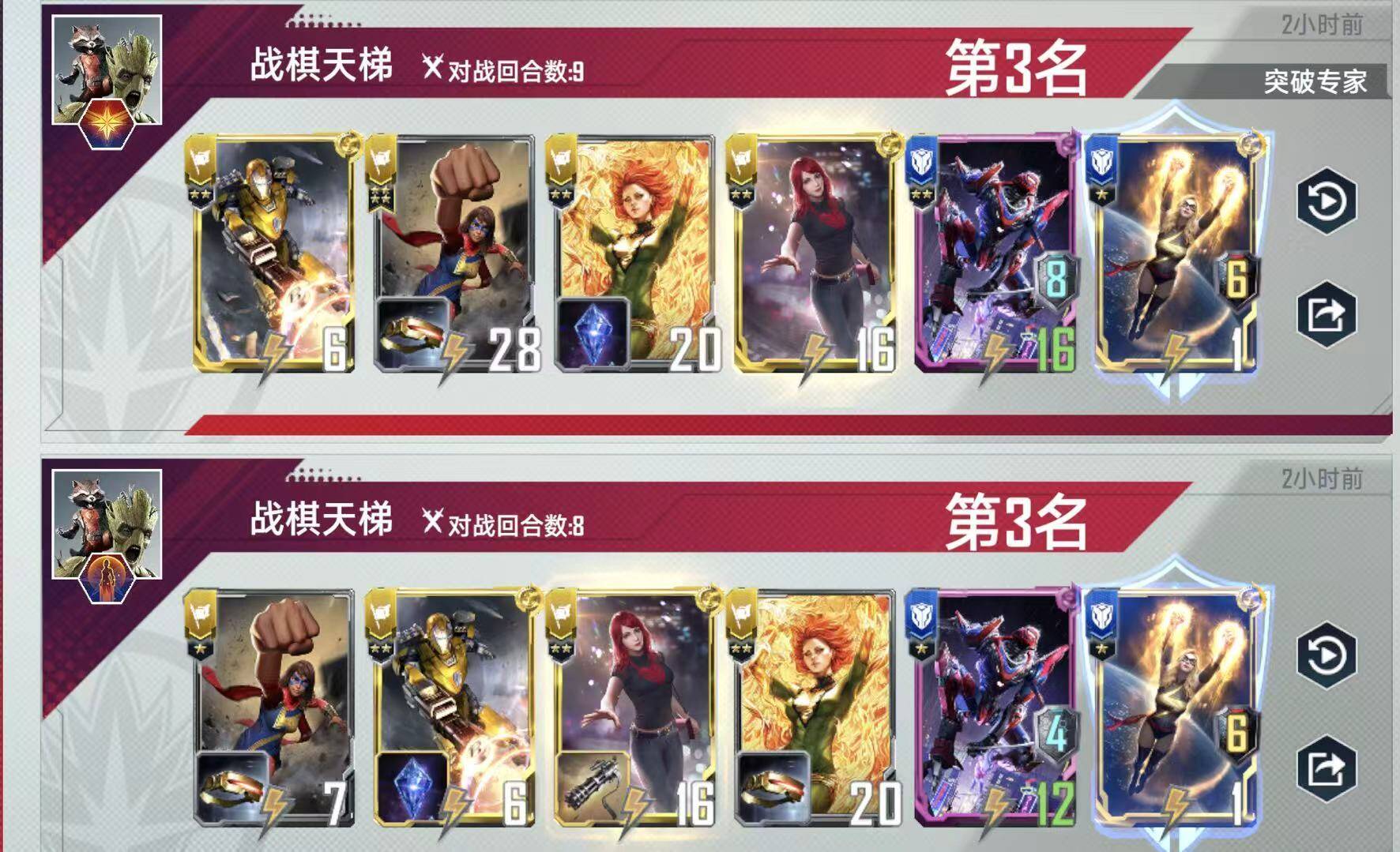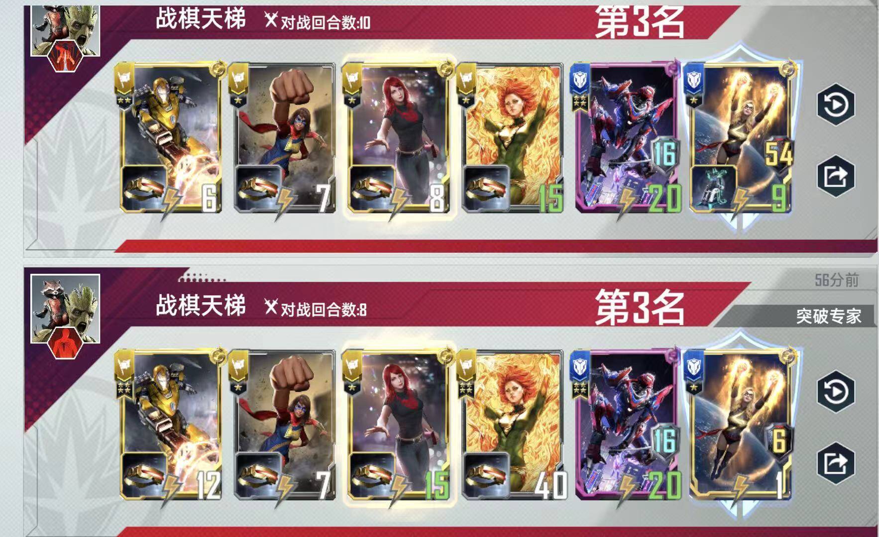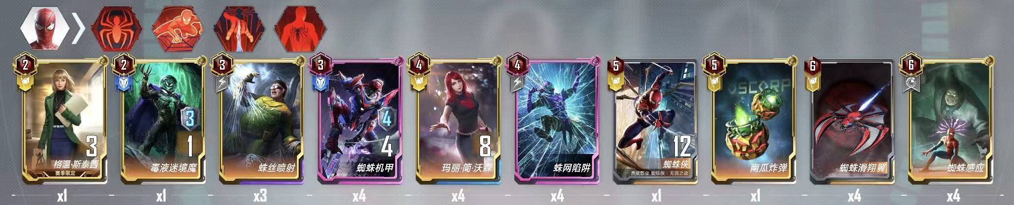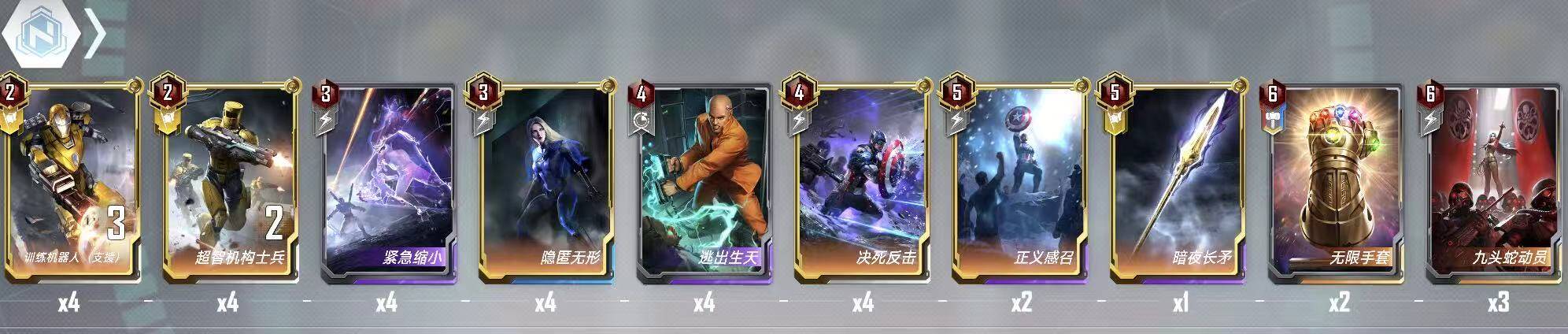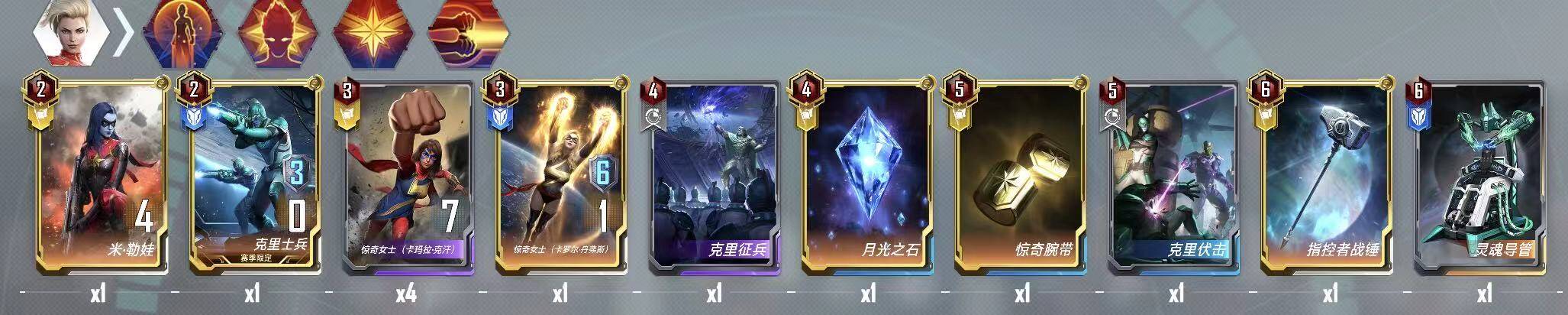 1-2-3本正常节奏,拿战力,不行就缩,拿完技能后升4本,找关键核心卡,一直卡4本甚至可以到0费升本,站位一般为:训练机器人(护目镜)+惊奇女士(护目镜)+玛丽(护目镜)+凤凰女(护目镜)+机甲(导管)+坚甲惊奇女士+手牌暴风女,如终局对方有蛛丝或精准刺杀再根据情况变换站位。