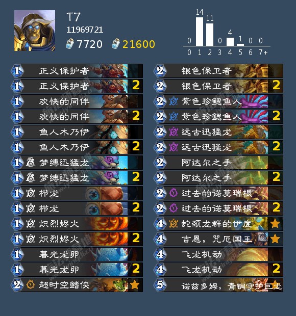 ### T7# 职业:圣骑士# 模式:标准模式# 甲虫年## 2x (1) 暮光龙卵# 2x (1) 栉龙# 2x (1) 梦缚迅猛龙# 2x (1) 欢快的同伴# 2x (1) 正义保护者# 2x (1) 炽烈烬火# 2x (1) 鱼人木乃伊# 2x (2) 紫色珍鳃鱼人# 1x (2) 超时空鳍侠# 2x (2) 过去的诺莫瑞根# 2x (2) 远古迅猛龙# 2x (2) 银色保卫者# 2x (2) 阿达尔之手# 1x (4) 吉恩,咒厄国王# 1x (4) 蛇颈龙群的伊度# 2x (4) 飞龙机动# 1x (5) 诺兹多姆,青铜守护巨龙# AAECAaToAgS/mQfGrwflwQeExAcN658EyaAEntQEtZ4G1J4G9YEHupYH15cHzpsH0JsH9a8H9sEHg8IHAAA=# # 想要使用这副套牌,请先复制到剪贴板,然后在游戏中点击“新套牌”进行粘贴。钻五连胜上传说,优开目前环境一切主流卡组,稍劣任务牧(环境极少)。起手必留飞龙机动(核心),无飞龙可留龙卵、梦缚迅猛龙、紫色珍腮鱼人、吉恩。飞龙机动目前超模单卡,四费打出基本可以劝退大部分对手。这套牌特别便宜,只用合成一张诺兹多姆(实在没尘也可不带,大部分对局打不出来,五费六费对面就投了)